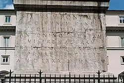 (Le pape Sixte Quint a rendu sa beauté originelle à cette colonne spiralée dédiée à l'empereur Antonin (sic) alors qu'elle se trouvait en état de ruine très avancé, l'an 1589 et la IVe année de son pontificat.)
