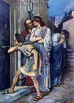 Quand l’Antipholus d'Éphèse revient chez lui pour le dîner, il est furieux de se voir rudement refuser l'entrée de sa propre maison par Dromio de Syracuse, qui garde la porte. Il est prêt à défoncer la porte, mais ses amis le persuadent de ne pas faire d’esclandre. Il décide plutôt d’aller dîner avec une courtisane.