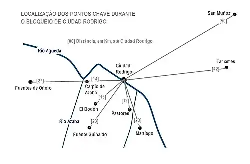 Face à la supériorité de son adversaire, et dans l'attente de son train de siège (artillerie et matériel du génie), Wellington se borne à isoler Ciudad Rodrigo en empêchant toute communication avec l'extérieur. Le blocus commence le . Le 12, Wellington établit son quartier-général à Fuenteguinaldo, alors que les forces non engagées dans les opérations de siège restent cantonnées à l'arrière. La coupure des lignes de communication entre Ciudad Rodrigo et Salamanque n'entraîne aucune réaction immédiate de la part des Français ; la cité assiégée a en effet été ravitaillée deux jours avant l'arrivée des Anglo-Espagnols et dispose de provisions jusqu'à début octobre. Un courrier intercepté le précise qu'un convoi de vivres est prêt à quitter Salamanque le 21, tandis que des dépêches également tombées aux mains des assiégeants informent que l'armée du Nord et l'armée du Portugal sont en train d'effectuer leur jonction, donnant une importante supériorité numérique aux Français.