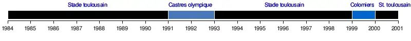 - ↑ Date exacte non connue. Dans les années 1960, une liste de cinq clubs aveyronnais est dressée, ces derniers étant partagés entre trois différents comités territoriaux, le Languedoc, le Limousin, et les Pyrénées[8]. Entre autres, le club aveyronnais du Stade olympique millavois est enregistré parmi les clubs du comité des Pyrénées évoluant en première division du championnat de France lors de la saison 1946-1947, puis en 1976-1977 et 1977-1978[9]. Le Stade ruthénois est quant à lui enregistré au moins depuis la saison 1970-1971, et de manière plus générale à plusieurs reprises dans les années 1970 et 1990[10]. En 1971-1972, le Sporting Club decazevillois est également enregistré auprès du Stade ruthénois[11].