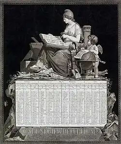 Le calendrier républicain est mis en application par le décret, de la Convention nationale, du 14 vendémiaire an II ()[60].