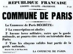 Un communard, une communarde[1], plus rarement communeux ou communaliste, est une personne ayant participé à une des communes insurrectionnelles de France en , dont notamment la Commune de Paris. La plupart exercent des professions libérales, sont petits commerçants, ouvriers, employés ou artistes (en tant que tels représentés au Conseil de la Commune), et ont pour points communs d'être républicains partisans de la démocratie directe et opposés à la capitulation française lors de la guerre franco-allemande de 1870-1871. Les profils politiques précis des communards sont variés mais une part importante se rattache au socialisme (tendances historiques de l'époque), à l'anarchisme ou à d'autre mouvements se réclamant de l'autogestion. Organisés défensivement au sein de la garde nationale lors de la guerre civile de 1871, ils furent écrasés militairement par l'armée régulière française fidèle au gouvernement de Versailles.