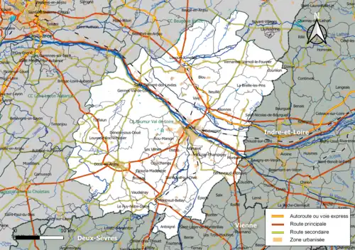 Située à l'est du département de Maine-et-Loire, dans le Baugeois et le Saumurois, de part et d'autre de la Loire, la communauté d'agglomération Saumur Val de Loire regroupe 45 communes et présente une superficie de 1 233,7 km2[6].
