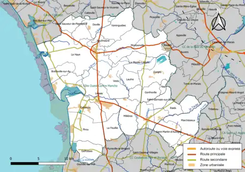 | 1 | Geffosses, Bretteville-sur-Ay, Feugères, Gorges, Saint-Sébastien-de-Raids, Varenguebec, Doville, La Feuillie, Saint-Nicolas-de-Pierrepont, Le Plessis-Lastelle, Anneville-sur-Mer, Saint-Germain-sur-Sèves, Neufmesnil, Raids, Auxais, Saint-Patrice-de-Claids, Gonfreville, Laulne, Saint-Sauveur-de-Pierrepont, Nay |