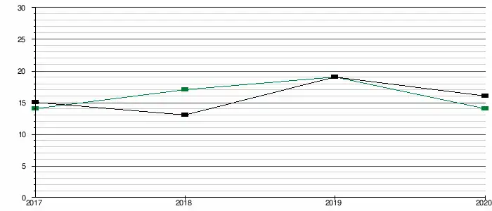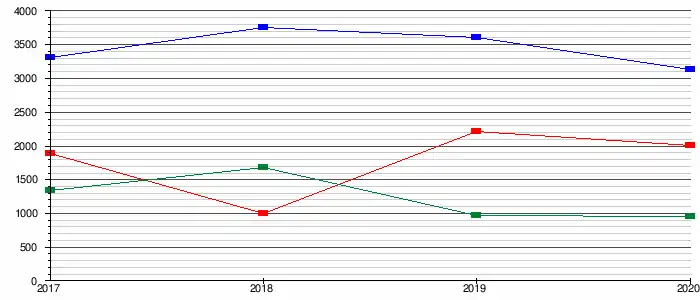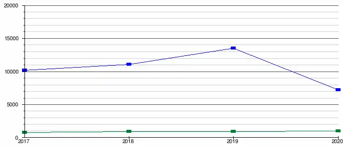 - la capacité d'autofinancement (CAF) pour une valeur de 6 199 000 €, soit 137 € par habitant. La capacité de désendettement est d'environ 2 années en 2020. Sur une période de 4 années, ce ratio est constant et faible (inférieur à 4 ans)