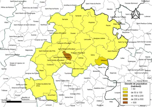 | Excideuil | 24164 | Excideuillais | 5,02 | 1 195 (2022) | 238 |