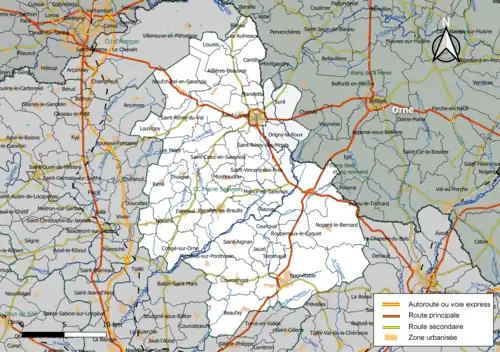 Situation de la communauté de communes dans la Sarthe, les communes de l'Orne sont en marron. | |