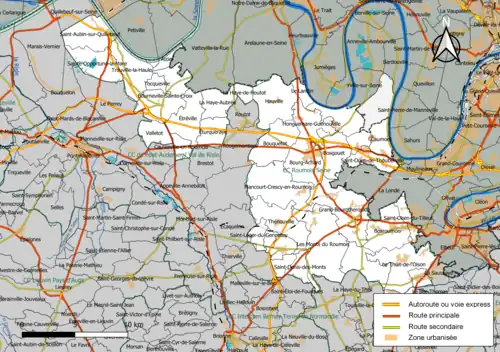 Située dans le nord du département de l'Eure, la communauté de communes Roumois Seine regroupe 40 communes et s'étend sur 338,7 km2[7]. Une de ces communes, Mauny, se trouve néanmoins en Seine-Maritime.