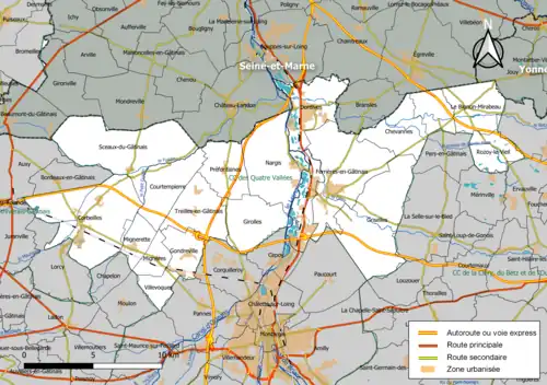 Située au nord-est du département du Loiret, la communauté de communes des Quatre Vallées (Loiret) regroupe 19 communes et présente une superficie de 286,9 km2[8].