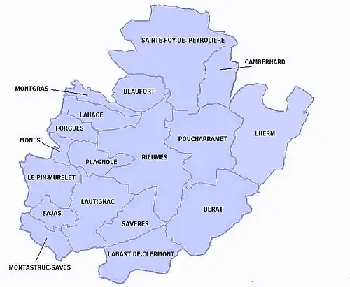 | Labastide-Clermont | 31250 | Clermontais | 14,58 | 677 (2014) | 46 |