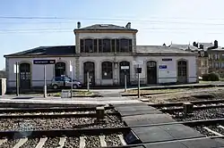 - La gare de Rethel est un édifice plus vaste, à la façade en pierre qui comporte un corps de logis à étage de trois travées sous toiture mansardée contre laquelle repose l'horloge de la gare[29] ; le corps central est flanqué de deux ailes sans étage de quatre travées avec des combles importants[29], et dont la toiture, à deux croupes est également mansardée. Les percements des ailes sont à arc bombé ; ceux du rez-de-chaussée du corps central sont à arc en plein cintre tandis que ceux de l'étage sont rectangulaires et surmontés d'un entablement. La façade, recouverte d'enduit, était à l'origine en pierre apparente[29] ; elle comporte des bandeaux et encadrements en pierre de taille.