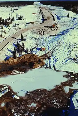 Parallèlement à ce tracé, une route de glace est construite pour déplacer les équipements et le matériel nécessaire vers le nord. Le projet atteint son premier objectif avec la mise en service, le , d'un pont de glace de 555 m[44] qui traverse la rivière Rupert[45],[46]. La route temporaire atteint la Grande Rivière en et permet de répondre aux besoins logistiques minimaux nécessaires pour engager les travaux ainsi que la construction des infrastructures nécessaires afin de loger et de nourrir les milliers de travailleurs qui se succéderont au cours des dix prochaines années.