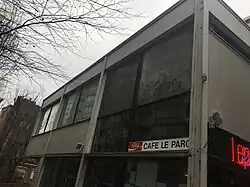 Les façades de la partie cinéma et café sont elles aussi composées d'une trame. Il y a néanmoins un contraste plus fort entre l'ossature métallique peinte d'une couleur foncée et les remplissages de blocs de béton cellulaire expansé enduits de ciment et peints[5]. Tandis que la partie cinéma affiche une façade aveugle, la partie café s'ouvre avec une façade principalement vitrée vers l'Est, c'est-à-dire sur la plaine de Droixhe, offrant une vue d'ensemble depuis la mezzanine du café.