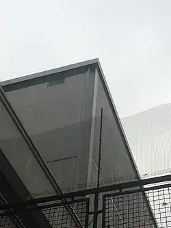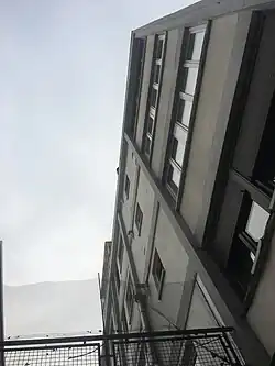 Le pignon exposé du volume de devant fait l'objet d'une composition dans le travail de coffrage. Les lignes horizontales se calquent sur les niveaux des étages, alors que les lignes verticales sont dessinées selon une composition libre. La plupart des panneaux sont peints, mais certains font l'exception en étant bouchardés[5].