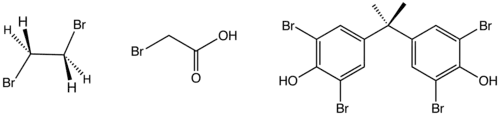 Structure de trois composés organobromés d'importance industrielle. De gauche à droite :bromure d'éthylène, acide bromoacétique et tétrabromobisphénol-A.