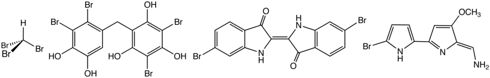 Structure de composés organobromés naturels. De gauche à droite : bromoforme, un bisphénol bromé, un dibromoindigo (pourpre de Tyr)et l'antiappétant tambjamine B.