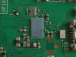 Puce électronique et deux condensateurs montés en surface sur un circuit imprimé.