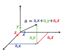 Composantes d'un vecteur dans un espace géométrique à trois dimensions, x, y et z. Dans le cas du concept géométrique classique de vecteur, il existe une identification complète entre ses «composantes» et les «coordonnées» qui le représentent. Cependant, il existe d'autres types d'espaces vectoriels (comme, par exemple, l'ensemble des polynômes d'ordre n), dans lesquels le concept de coordonnée n'a pas la généralité de l'idée de composante.