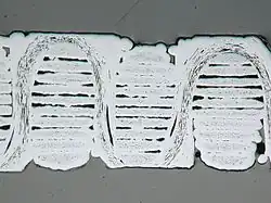Avec ces propriétés, les fibres peuvent aussi être tissées en structures à deux ou trois dimensions (voir figure). Dans le travail, par exemple le tissage, les fibres doivent présenter de hautes résistances à la traction et résister à de petits rayons de courbure.