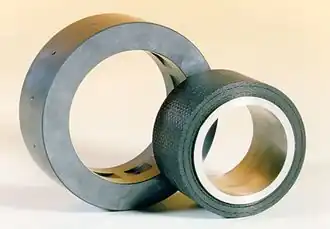 Dans les paliers de pompes, on utilise avec succès le SSiC ou le SiSiC, moins cher, depuis maintenant plus de 20 ans[19]. Le palier utilise le liquide pompé comme lubrifiant. La cause du succès de ce concept de palier est la résistance à la corrosion envers presque tous les milieux, et la très faible abrasion par les frottements ou par les particules contenues dans le fluide, en raison de la grande dureté de la céramique, ainsi que le bas coefficient de frottement donné par la lubrification par le fluide. Les composants en SiC du palier consistent en coussinets de protection de l'axe montés sur l'axe et tournant dans le boîtier. Un boîtier de palier en SiC est en règle générale enserré dans son environnement métallique et sous pression. Une rupture fragile de ce composant est ainsi très peu probable. Le coussinet en SiC n'a pas cet avantage, et est exécuté en plus grande épaisseur, et/ou avec des spécifications de construction spéciales. Pour de grandes pompes, avec des axes de diamètre approprié (100 à 300 mm), ainsi que pour les pompes à forte charge sur les paliers, à cause du risque de cassure du coussinet, ce n'est qu'avec l'avènement des céramiques composites qu'on a pu utiliser le concept de palier céramique. On a pu démontrer au banc d'essai qu'en appariant du CVI-SiC/SiC avec du SSiC conventionnel, l'ensemble supporte presque trois fois la charge spécifique d'autres appariements, dans des conditions de frottement partiellement à sec[20].
