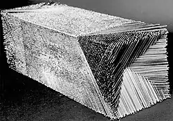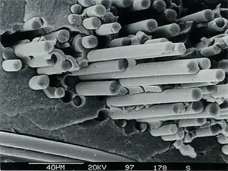 - Plaques en CVI-SiC/SiC à structure de fibres tridimensionnelle, pour le revêtement des domaines chauds les réacteurs de fusion[25]. La structure tridimensionnelle facilite la conduction thermique perpendiculairement à la surface. Comme le SiC s'est montré relativement stable dans un environnement irradié par des neutrons, on utilise ici des fibres de SiC cristallin, dont la stabilité à haute température s'avère bien meilleure que le SiC amorphe.
