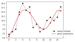 La compression peut également intégrer une étape de lissage dans le cas où des variations parasites se superposent à la courbe (exemple de mesures bruitées). Le lissage peut s'effectuer avant compression (filtre numérique) ou après compression.