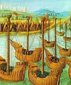 - La république de Pise établit une domination sur la Sardaigne en 1017, la Corse en 1051, et les Îles Baléares en 1085, ainsi que d'importantes routes commerciales vers les États latins d'Orient, les principales métropoles portuaires de l'Empire byzantin, et des villes africaines comme Alexandrie et Tunis. Néanmoins, Pise perd la majorité de sa flotte lors de sa défaite contre Gênes à la bataille de la Meloria en août 1284, ainsi que ses comptoirs commerciaux en Méditerranée annexés par Gênes[47].