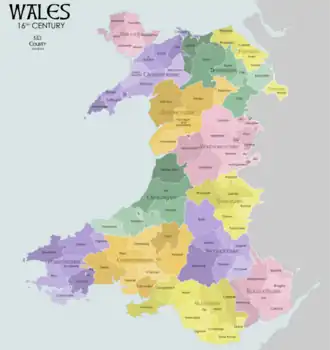 À la manière des comtés d’Angleterre, les comtés du pays de Galles incorporés au royaume sont divisés en hundreds à la suite du Laws in Wales Act 1542. Avant cette loi, les territoires du pays de Galles médiéval s’organisent en cantrefi, subdivisions administratives et légales se composant de commotes (ou cymwds en gallois) de tailles variables[17].