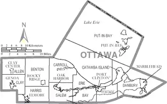 - villages : Clay Center, Elmore (partagé avec le comté de Sandusky), Genoa, Marblehead, Oak Harbor, Put-in-Bay et Rocky Ridge.