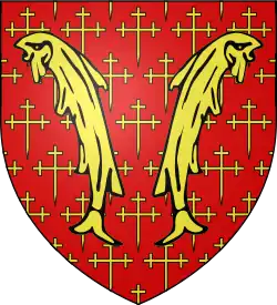 - ↑ Toutefois, Dom Calmet nous décrit plus simplement l'écu comtal du XIIIe siècle D'or à truites adossées, accompagnées de croisettes répandues.