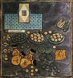 Les insignias du comte des largesses sacrées dans la Notitia dignitatum : sacs de pièces et métaux, désignant son contrôle sur les mines et les ateliers monétaires, et le codicille de sa nomination.