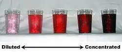 On peut décrire une solution comme « diluée » ou de « faible » concentration pour une concentration basse et, à l'inverse, on utilisera les mots « concentrée » ou de « forte » concentration. Par exemple : une solution colorée sera plus concentrée si elle contient plus de molécules de matière (soluté ou solvant) colorée.