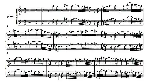 Le troisième mouvement est une véritable prouesse formelle : il combine une forme Lied (ABA') avec une forme Rondo (aba(A) cdc(B) aea(A'), a étant le refrain) et une forme « en arche » qui se concentre sur la partie centrale du rondo (elle-même encore subdivisée à nouveau en trois sous-parties). De plus, une véritable fugue modale (en Do# dorien ou mode de Ré sur Do#) s'y intègre (partie b du rondo).