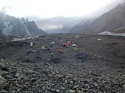 Camp à Concordia avec le pic Mitre à l'arrière-plan.