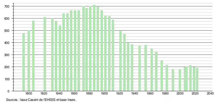 L'évolution du nombre d'habitants est connue à travers les recensements de la population effectués dans la commune depuis 1793. Pour les communes de moins de 10 000 habitants, une enquête de recensement portant sur toute la population est réalisée tous les cinq ans, les populations de référence des années intermédiaires étant quant à elles estimées par interpolation ou extrapolation[23]. Pour la commune, le premier recensement exhaustif entrant dans le cadre du nouveau dispositif a été réalisé en 2008[24].