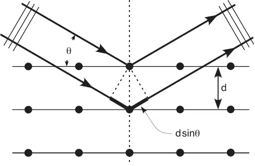On peut retrouver la loi de Bragg de manière simple. Considérons deux rayons parallèles frappant deux atomes situés sur une même droite perpendiculaire à la surface du matériau. Le chemin supplémentaire parcouru par le rayon « profond » est , puisqu'il suit les côtés opposés à un angle de triangles rectangles d'hypoténuse . Les interférences sont constructives si la différence de chemin introduit un déphasage multiple de , c'est-à-dire si le chemin supplémentaire est un multiple de .