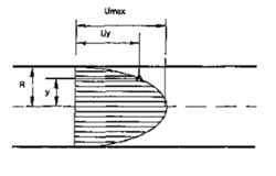 Où f est le coefficient de frottement[5]. Une bonne estimation d'un profil de vitesse entièrement développé peut être utilisée pour ceux qui ne disposent pas d'équipement adéquat pour réellement mesurer les vitesses d'écoulement dans le tuyau. La longueur équivalente de tuyau droit suivante dans l'équation (3) était utilisée pour garantir qu'un profil d'écoulement entièrement développé existe[6].