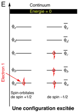Chaque électron d'une configuration électronique donnée est entièrement décrit par une spinorbitale , produit d'une fonction d'espace (orbitale) par une fonction de spin , la valeur propre de cette dernière pouvant valoir ou . La fonction d'onde d'un système à n électrons peut être vue comme le produit des n spinorbitales de ces électrons individuels (produit de Hartree) :