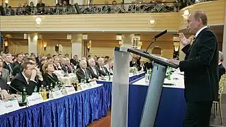 L'arrivée au pouvoir de Vladimir Poutine en 2000 marque un tournant dans la politique intérieure et extérieure russe. Bien qu’il conserve, dans un premier temps, la même approche que celle de son prédécesseur concernant les relations avec l’Ouest, l'objectif affiché est de restaurer l'État russe, affaibli par la décennie précédente, et de renforcer son autorité sur la scène internationale. Durant ses premiers mandats, Poutine cherche principalement à redresser économiquement le pays, profitant de la hausse des prix des matières premières. La politique extérieure reste relativement modérée, malgré des tensions persistantes concernant l'élargissement de l'OTAN et l'influence occidentale dans l'espace post-soviétique. Toutefois, un tournant majeur va avoir lieu en 2007 lors du discours de Vladimir Poutine à la conférence de sécurité de Munich (en). Il y dénonce ouvertement l'unilatéralisme (en) des États-Unis, critique l'élargissement de l'OTAN qu'il qualifie de provocation et réaffirme la volonté de la Russie de défendre ses intérêts stratégiques[12],[13]. Ce discours est largement interprété comme la fin de la phase de coopération et l'amorce d'une politique étrangère plus agressive.