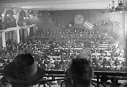 Après deux autres conférences préparatoires en 1933 et en 1934, la première assemblée plénière s'est tenue du 8 au 14 août 1936 à Genève, à la Salle du Conseil général du Bâtiment Électoral[27]. Elle a fondé le Congrès juif mondial sous la forme d'une organisation permanente et démocratique. L'élection des délégués à cette assemblée devait être conforme aux principes démocratiques, à savoir être secrète, directe et basée sur une représentation proportionnelle. Ainsi par exemple, les 52 délégués américains ont été choisis lors d'une Convention électorale qui s'est réunie à Washington les 13-14 juin 1936. Quelque 1 000 représentants de 99 communautés dans 32 États américains y ont participé[28].