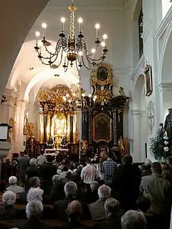 Après une période d'étude et de réflexion à Vienne, les deux religieux s'installent à Varsovie en 1787. Cette installation dans une ville où ils ne sont initialement que de passage est liée à la présence du nonce apostolique d'origine napolitaine, Ferdinando Maria Saluzzo, et à l'invitation de la confrérie germanophone de Saint-Bennon, administrant l'église du même nom, à assumer la charge pastorale de cette église, d'une école et d'un orphelinat, en résidant au couvent attenant[42]. L'église devient alors un lieu de mission perpétuelle, trois grand-messes chantées y étant célébrées tous les jours, et cinq sermons, dont deux en allemand et trois en polonais, y sont donnés. Ces exercices pieux s'accompagnent du chemin de croix, de la visite au Saint-Sacrement selon la méthode de Saint Alphonse, d'un examen de conscience et d'une biographie du saint du jour. Ces entreprises pieuses s'accompagnent aussi d'entreprises sociales, l'orphelinant donnant une formation professionnelle aux orphelins multipliés par l'état de guerre qui règne en Europe[43]. Pour accompagner son action, Hofbauer fonde une congrégation féminine, les Sœurs de Saint-Joseph, dédiées à l'éducation des jeunes filles dans une école jointe à l'église Saint-Bennon[44].