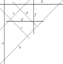 Le graphe G affiché ci-dessous à gauche peut être représenté comme le graphe d'intersection de l'ensemble des segments donnés ci-dessous à droite. Ici, les sommets de G sont représentés par des segments de droite et les arêtes de G sont représentées par les points d'intersection.