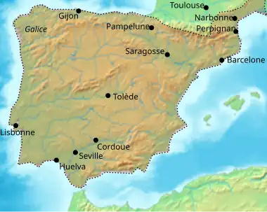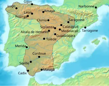 Au début du IXe siècle, les musulmans occupent la péninsule Ibérique, à l'exception du royaume des Asturies jusqu'en 925 et de la marche d'Espagne.