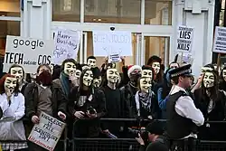 - ↑ (en) John S. Forrester, « Dozens of masked protesters blast Scientology church », sur boston.com, .