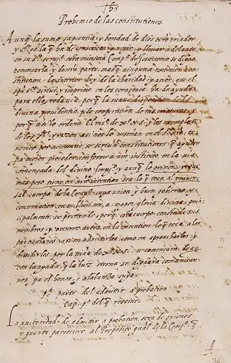 Une première ébauche sort en 1541. Elle est révisée et enrichie au fur et à mesure des premières années d'activité. En 1544 et 1545, sont formulées les Constitutions concernant les compagnons envoyés dans les missions (cf. 7e partie), et de 1540 à 1550 sont rédigés trois essais de Constitutions pour les collèges (cf. 4e partie).