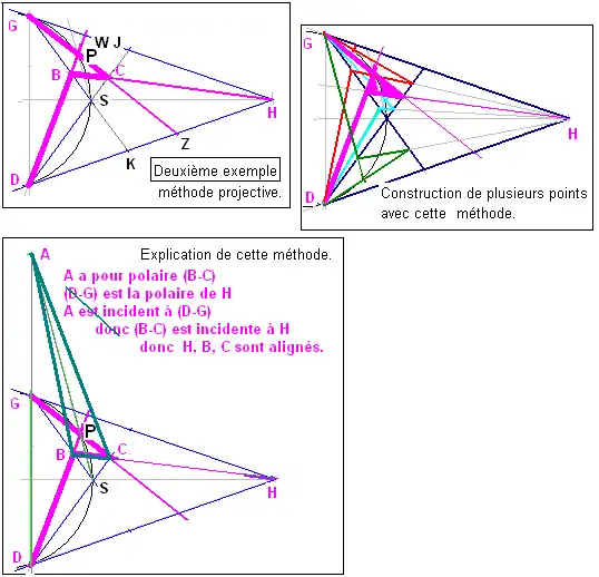 - quatre points sur une conique forment un quadrangle dont le triangle diagonal est autopolaire, donc à partir du quadrangle GDSP le triangle ABC est autopolaire, donc BC est la polaire de A.
