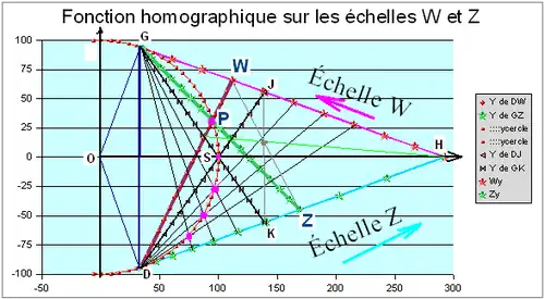 Dans le plan de cette figure considéré comme plongé dans un plan projectif fondamental, on peut établir une (parmi d'autres possibles) transformation homographique entre les deux êtres mathématiques unidimensionnels que sont les faisceaux de centre Z et O. Ceci en se dispensant de travailler sur les échelles de points X et Y. On utilisera H, le point à l'infini dans la direction de l'axe OX et le faisceau de droites de centre H, c’est-à-dire le faisceau des droites parallèles à OX.