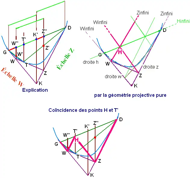 La correspondance homographique entre les alignements W et Z peut être construite d'une manière graphique, sans calculs analytiques, grâce à un parallélogramme variable KWHZ. Soit la transformation T définie comme la succession de 2 transformations de points projectives unidimensionnelles ; la première est la perspective de centre Z∞ de la droite w sur la droite h correspondant à la corde GD; la seconde est la perspective de centre W∞ de la droite h sur la droite z.