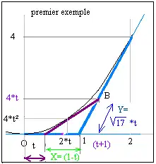 - Dans le premier exemple, la conique est la parabole y = x2 qu'on appuie sur deux droites : la première est l'axe des abscisses, la seconde est la tangente à la parabole au point de coordonnées (2 ; 4) ; une tangente variable, au point de la parabole (2t , 4t2), coupe ces deux droites aux distances (par rapport à leur coude) respectives X = 1 – t et Y = t√17, le point B ayant comme coordonnées (t + 1 ; 4t). En éliminant le paramètre t entre ces deux équations, on obtient la relation : Y = (1 – X)√17, qui n'est qu'un cas particulier et dégénéré de la fonction homographique : , dans laquelle c = 0, d = 1, b = √17, a = –√17.