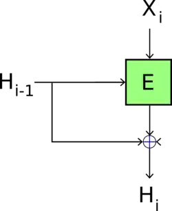 La sortie de la compression précédente (ou la valeur d'initialisation dans le cas de la première itération) est chiffrée avec le bloc actuel du message . Un XOR est ensuite appliqué entre la sortie de la fonction de compression et la sortie de la compression précédente pour générer la valeur de hachage actuelle [1].